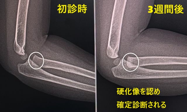 | 橈骨頚部骨折は肘が伸びた状態で手をついて転倒した際に、関節に外反力が強制され橈骨頭と上腕骨小頭が衝突して骨折が発生します。6歳から13歳によく認められます。 症状 肘の痛みや腫れで、痛みのために肘を動かそうとしません。 診断 レントゲン検査が不可欠です。しかし転位(ずれ)のない症例は見逃され易いので注意深い観察が必要です。数週間後のレントゲン検査で硬化像(骨がつき始めている状態)を認め、確定診断されることもよくあります。 治療 保存的治療(手術しない方法)が原則です。 1)保存的治療 転位のない症例や転位が軽度な症例は三角巾や数週間のギプス包帯で治療します。転位が著明な症例や将来、肘の変形や運動障害が予測される症例では全身麻酔を用いて徒手整復術を行い固定ます。 2)手術的治療 保存的治療(手術しない方法)で整復されない症例や粉砕例(バラバラになった骨折)は骨接合術(骨をつなぐ手術)が必要となります。時に放置され、成人になって偽関節や変形性肘関節症を来たし受診されることもあります。正確な診断と治療が必要です。なお、成人の症例は橈骨頭骨折・橈骨頚部骨折を参照されて下さい。