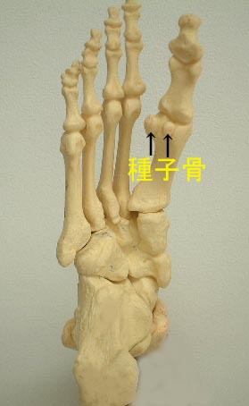 | 種子骨とは、先天的に発生した小骨片で関節包の周囲や腱などの中に存在して摩擦の軽減に関与しています。母趾の種子骨は短母趾屈筋腱の中に存在し、親指の根元に2個あります。その作用は長母趾屈筋腱を保護し歩行時に母趾にかかる負担を軽減する役割を担っています。 種子骨障害 種子骨障害とは、何らかの原因で種子骨周辺にある滑液包や腱鞘が炎症を起こして痛みが生じた状態です。 症状 症状は母趾球部の痛みと腫れです。種子骨周辺の滑液包や腱鞘が炎症を起こす発症します。 診断 レントゲン検査です。先天的な種子骨異常(大半は種子骨が2つに分裂している二分種子骨です)を認める症例やスポーツ活動によって起こる疲労骨折を経験します。 治療 1)保存的治療(手術しない方法)が原則です。 軽症例はスポーツ活動や作業を極力制限していただき、物理療法や疼痛緩和にアセトアミノフェン、炎症緩和に非ステロイド性抗炎症剤などを短期間処方します。疼痛の強い症例はステロイド注射を検討します。頑固な症例ではインソール(種子骨部に体重が乗らない状態にする中敷き)の着用をすすめます。これらの治療で大半は改善されます。 2)手術的治療 保存的治療で改善されない症例は手術(関節形成術、種子骨摘出術)が検討されます。