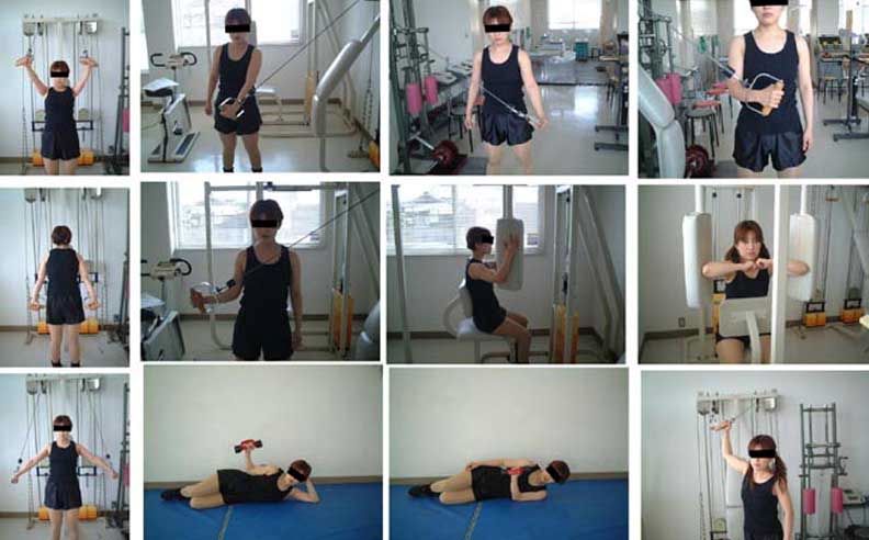 は三角筋、上腕二頭筋、肩回旋筋群(棘上筋、棘下筋、小円筋、肩甲下筋)、上腕三頭筋などの筋力強化を指導します。筋力強化は等尺性訓練や等張性訓練などを行います。訓練は最大の筋力で目的の筋肉を5秒間収縮させ、数秒間休憩します。10回をワンセットとし、一日に3セット行います。