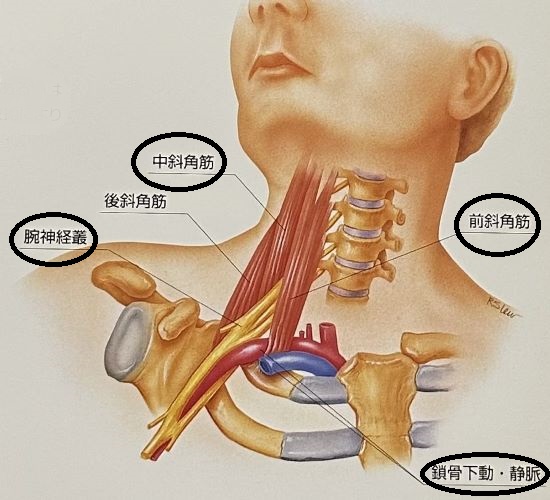 | 腕神経叢と周囲の血管(鎖骨下動脈、鎖骨下静脈)が胸郭出口部で骨(頚肋、鎖骨、第一肋骨)や筋肉(前斜角筋、中斜角筋)によって圧迫および牽引されて起こる症状を言います。わかりやすく言いますと、胸郭出口症候群とは頚神経が腕神経叢から腕に下る際の関所のような部位と考えて下さい。 この関所の入り口や出口が狭いと、神経、血管が圧迫されて首の痛み、肩の痛み、腕の痛み、背中の痛み、頭痛、肩凝り、しびれ、冷感など様々な症状を発生させます。さらに腕神経叢は周囲の交感神経と複雑なネットワークを構築しています。そのため自律神経様の症状を訴えることもあります。 女性は20〜30代に多く、なで肩で頚部周辺の筋肉の発育が悪い人によく認められます。頚部周辺の筋力が弱いと腕神経叢が腕の重さに耐えかねて胸郭出口部で引っ張られ神経炎を発生させます。逆に男性の場合は中高年に多く、怒り肩や筋肉質で首の短い人に認められます。このような方は腕神経叢や血管が周囲の組織で圧迫され、神経炎や血行障害が生じ起こると考えられています。 診断 診察では誘発テストを行います。すなわち、胸郭出口部が最も圧迫や牽引される肢位にして、症状の再現性をチェックするテストです。Morley test やAdson test 、Eden test 、Wight test 、Roos testなどの検査があります。レントゲン検査で頚肋(下部の頸椎に肋骨がある症例)、不良姿勢などを検討します。なお、頚肩腕症候群、頚椎症などの鑑別(見極め)が必要です。 治療 1)保存的治療 まず日常生活動作の注意点を指導します。すなわち、首の姿勢、腕を下げて行う作業、重たい物を持ち上げたりしないように指導します。症状の緩和に物理療法(頚部のストレッチを兼ねた頸椎牽引など)と頚部のストレッチング、筋力強化訓練を指導します。 また腕神経叢の緊張緩和に肩甲帯支持バンドの着用も検討します。疼痛緩和にアセトアミノフェンや炎症緩和に非ステロイド性抗炎症剤や外皮用薬、神経性の疼痛緩和に神経障害性疼痛薬を短期間処方します。自律神経様の症例には抗不安剤や抗うつ剤なども検討されます。さらに星状神経節ブロック、肩甲上神経ブロック、腕神経叢ブロックなど神経ブロック療法も考慮します。 2)手術的治療 保存的治療で改善されない症例が対象となります。近年、鏡視下手術で神経、血管、筋肉の癒着剥離と第一肋骨摘出術などが行われ良好な成績が報告されています。