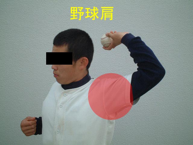 | 野球などの投球動作で起こる肩の障害を言います。野球以外のスポーツでは、バレーボールやハンドボール、バスケットボール、バトミントン、槍投げ、テニスなどでよく見られます。投球動作はワインドアップ期・コッキング期・加速期、リリース期・フォロースルー期の5つの動作で構成されています。なお、子供の投球動作によって起こる肩の障害をリトルリーグ肩と呼びます。こどもの整形外科を参照されて下さい。 ■ワインドアップ期 投球動作に入るまでの動作です。この動作は下半身が主導ですので、肩の障害は起きません。 ■コッキング期 肩が最大限に外転、外旋する時期までの動作です。肩関節は外転・外旋運動が強制されるため肩の前方が引き伸ばされて三角筋前部や上腕二頭筋長頭腱は牽引され、棘上筋は収縮します。 そのため三角筋炎や棘上筋腱炎、上腕二頭筋長頭腱炎、インピンジメント症候群、腱板損傷が発生しやすくなります。 ■加速期からリリース期 加速器はボールを投げ始めてからボールを手放すまでの動作です。リリース期はボールが手から離れ、腕の動きが急に減速される時期までの動作です。 「加速期からリリース期」では最もスピーディーな動作が行われる時期です。肩関節は外転、内旋運動が強いられるため三角筋中部と後部は引き伸ばされ、棘上筋や棘下筋、小円筋などの腱板は収縮から一転して伸展します。 そのため肩峰下滑液包や鳥口肩峰靭帯により圧迫され、腱板損傷や肩峰下インピンジメント症候群、三角筋炎、肩関節不安定症などが発生しやすくなります。 ■フォロースルー期はボールを投げ終えて投球動作が終わるまでの動作です。上腕三頭筋の収縮により腕は前方へ振り出されて、肩の後面は引き伸ばされます。 そのため上腕三頭筋腱炎や肩関節の後方の関節包や関節唇を損傷しやすくなります。以上のように肩は投球動作によって色々な障害が発生します。 治療 1)保存的治療(手術しない方法)が原則です。 投球動作を一旦中止していただきます。物理療法や運動療法(肩のストレッチングや筋力強化訓練)を検討します。疼痛緩和にアセトアミノフェン、炎症緩和に非ステロイド性抗炎症剤や外皮用薬などを必要に応じて処方します。難治例にはステロイドの注射を試みることもあります。予防には肩の筋力強化に加え、体幹の筋力強化(腰の筋力強化訓練、股関節の筋力強化訓練)も指示します 2)手術的治療 保存的治療で改善が得られない症例に行われます。障害部位である骨や軟骨、関節包、関節唇、腱板などの損傷に応じて手術が検討されます。術式は肩関節鏡視下手術(関節包縫縮術、関節唇修復術、骨欠損修復術、腱板修復術)などが行われます。