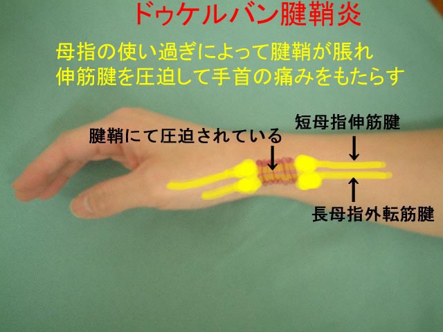 | 狭窄系腱鞘炎は、別名「ドゥケルバン腱鞘炎」とも言われ、手首における代表的な腱鞘炎です。長母指外転筋腱と短母指伸筋腱が橈骨茎状突起部周辺(手首の親指側の突起部))で狭窄されて発生します。 原因 職業、趣味、スポーツなどで手首や母指を酷使(使いすぎる)する方に認められます。中には、軽微な外傷(打撲、捻挫など)や妊娠、出産、更年期をきっかけに発生する症例もあり、ホルモンとの関係が示唆される症例もあります。時にガングリオンなどの腫瘍で腱が圧迫されて起こることもあります。 症状 症状は母指側の手首の痛み、腫れ、運動障害です。痛みは物を摘まんだり、手首を小指側に倒すと痛みが増強します。 治療 1)保存的治療(手術しない方法)が原則です。 痛みの誘因となった作業や運動を極力控えていただきます。物理療法や手首のストレッチを指導します。炎症緩和に短期間の非ステロイド性抗炎症剤や外皮用薬を処方します。これらで効果が認められない症例はステロイド腱鞘内注射を検討します。 2)手術的治療 保存的治療で効果がない症例、再発を繰り返す症例は腱鞘切開術を検討します。腱鞘切開術の成績は良好です。大半の患者さんは満足されます。