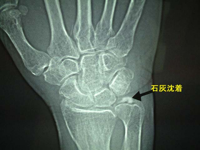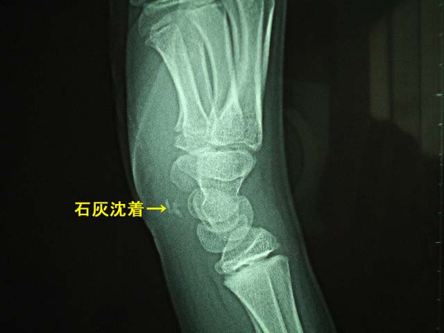 | 手部の腱や靭帯、関節包の周囲に石灰物が沈着する疾患です。原因は不明です。中高齢者に多く認められ、症状として手関節や手指に激痛、脹れ、発赤(赤くなる状態)を認めます。 診断 レントゲン検査で手関節部や手指に石灰物が確認できれば確定診断されます。稀に若年者にも発生することがありますので要注意です。なお痛風や偽痛風の鑑別が必要です。 治療 激しい痛みを訴えますから痛みを除くことが先決です。疼痛緩和にアセトアミノフェン、炎症緩和に非ステロイド性抗炎症剤、外皮用薬などを処方します。効果がなければステロイド注射を試みます。改善されない症例は石灰摘出術を検討します。