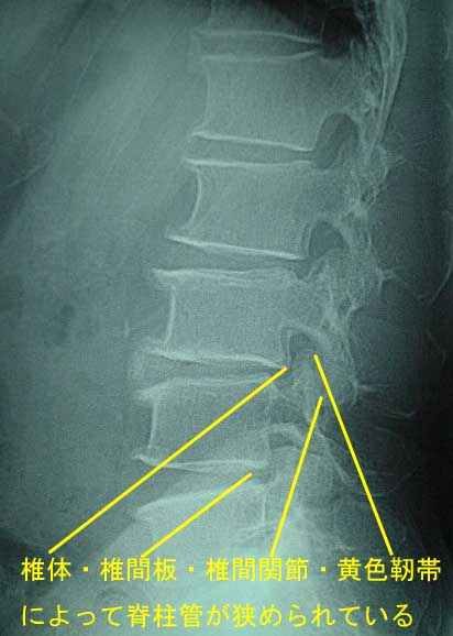 | 腰椎は5個の椎骨(レントゲン側面像)からなります。前方部分と後方部分で構成されています。前方部分は椎体や椎間板、横突起よりなります。後方部分は椎弓根や椎弓 、椎間関節、棘突起よりなります。前方部分と後方部分で囲まれたスペースを脊柱管(脊髄が入っている管)と言います。 脊柱管内には馬尾や腰神経、仙骨神経が存在します。馬尾から左右5対の腰神経・仙骨神経が枝分かれします。腰神経は椎間孔(腰神経が出てゆく穴)より出て坐骨神経となり臀部から大腿〜下腿〜足先へ下降します。 |
