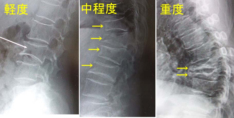| 骨粗鬆症自体の特有な症状はありません。すなわち、初期は骨が脆いだけでは何の症状もありません。しかし、骨粗鬆症が悪化すると、脊柱が変形して背部痛、腰痛、歩行障害などを訴えます。最も怖い出来事は、骨が脆いために起こる全身の骨折です。 代表的な骨折として骨粗鬆症性脊椎圧迫骨折、大腿骨近位部骨折、上腕骨近位端骨折、橈骨遠位端骨折、肋骨骨折などがあります。 中にはいつの間にか骨折や疲労骨折を起こすこともあります。高齢者ではこれらの骨折をきっかけに日常生活動作(ADL)や生活の質(QOL)が急激に低下してロコモティブシンドロームを生じ、将来、介護が必要となりますので要注意です。 脊椎圧迫骨折は70歳代で25%、80歳代で40%に認められます。稀に骨片(骨折の破片)によって脊髄が圧迫されて脊髄麻痺を起こし下半身麻痺になることもあります。また、大腿骨近位部骨折を起こすと20%が「寝たきり」になると言われています。高齢者にとって骨粗鬆症は生命予後に大きく影響します。 |