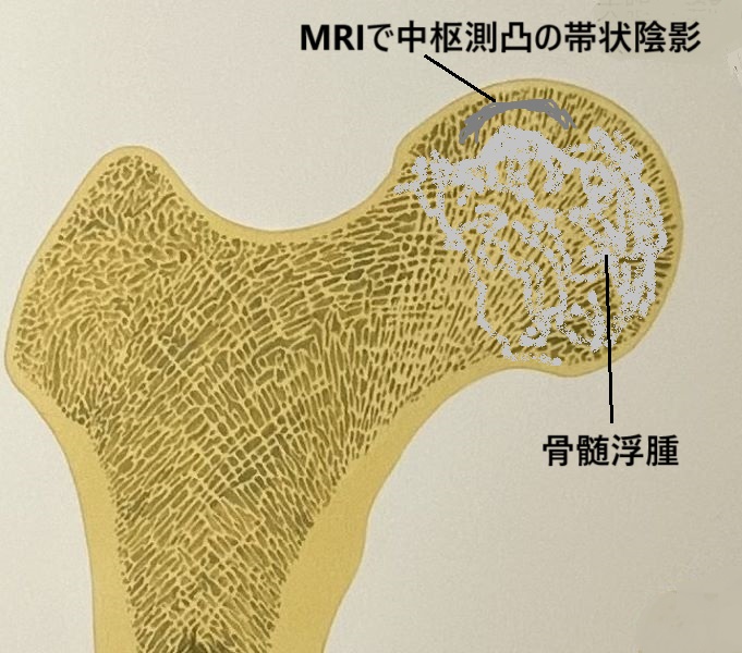 | 大腿骨頭軟骨下脆弱性骨折は、繰り返される軽微な日常生活の動作やスポーツ活動により、大腿骨頭の軟骨直下(軟骨は4層からなります。その深層部の石灰化層の下)の骨が「いつの間にか骨折」する疾患です。骨粗鬆症のある60~80歳の高齢者に多く、肥満の女性によく認められます。 症状 股関節痛や運動障害、歩行障害、跛行(かばうように歩く状態)を認めます。時に腰痛や臀部痛、膝痛を訴えることもあります。 診断 レントゲン検査やMRI、CTが必要です。特にMRIは早期の診断に大切です。特徴的な所見として中枢凸の帯状バンドが出現します。鑑別疾患(見極め)に大腿骨頭壊死や変形性股関節症などがあります。最終的な確定診断は病理組織検査です。時に短期間に関節が破壊される急速破壊型股関節症に移行する症例もありますので要注意です。 治療 1)保存的治療 軽症例は松葉杖を用いて免荷歩行(体重をかけずに歩行)していただきます。肥満があれば肥満解消を指示します。疼痛緩和に物理療法やアセトアミノフェン、炎症緩和に非ステロイド性抗炎症剤、外皮用薬を処方します。効果がなく、慢性的に疼痛を有する症例はトラマドール塩酸塩、デュロキセチンを検討します。運動療法として股関節のストレッチング、体幹のストレッチング、股関節の筋力強化、体幹の筋力強化を指導します。 2)手術的治療 保存的治療で改善されない症例や進行性の症例では手術が検討されます。手術は骨切り術と人工関節に分かれます。 骨切り術は骨頭に正常な組織があれば、一旦、骨を切離し正常な骨組織で荷重させる手術です。術式は大腿骨骨頭回転骨切り術や大腿骨内反骨切り術、大腿骨外反骨切り術などがあります。 人工関節は骨切り術の適応にならない広範囲の軟骨下損傷の症例や変形性股関節症になった症例です。術式は人工骨頭置換術(骨頭のみを人工物に入れ替える手術)と全人工股関節置換術(骨頭と受け皿である臼蓋をともに人工物に入れ替える手術)を検討いたします。