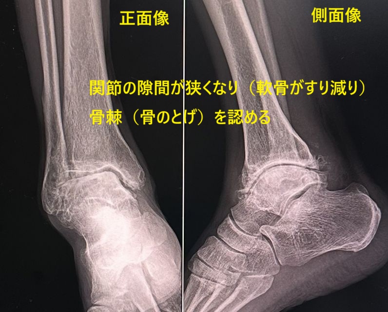 | 変形性関節症は、関節軟骨の老化や磨耗によって起こる軟骨と骨の進行性の変性疾患です。人間は二足歩行ですから、体重がかかる荷重関節(膝関節、股関節、脊椎、足関節)は体重がかからない非荷重関節(肩関節、肘関節、手関節)に比べ変形性関節症の発生を多く認めます。 しかし、荷重関節の中にあって足関節は股関節や膝関節に比べ変形性関節症の頻度は少ないようです。このことは足関節が形態的に安定した関節で、多数の強靭な靭帯を有し、支持性や安定性に関与する足根骨があるため足関節にかかる衝撃や負担が少ないためと考えられています。 変形性足関節症 変形性足関節症は、一次性(明らかな原因がない症例)と二次性(明らかに原因がある症例)に分かれます。二次性は下腿骨折や足関節果部骨折、足関節靭帯損傷、踵骨骨折などの外傷や感染、炎症性疾患後に発生します。大半は二次性です。中には麻痺性疾患(脳性麻痺やポリオなど)や先天性内反足に伴って発生することもあります。 症状・診断 症状は痛みや腫れ、変形、運動障害、歩行障害です。診断はレントゲン検査では関節裂隙の狭小化(軟骨が磨耗している)や骨棘形成(骨のとげ)、不安定性(関節がグラグラしている)などの所見を認めます。詳細な情報にはMRIやCTが必要です。 治療 1)保存的治療 日常生活動作の注意点や肥満に対する指導を行います。疼痛緩和に物理療法やアセトアミノフェン、炎症緩和に非ステロイド性抗炎症剤、外皮用薬などを処方します。効果がなければトラマドール、デュロキセチンを検討します。難治例にはステロイド注射を試みます。 運動療法として股のストレッチングや膝のストレッチング、足首のストレッチング、アキレス腱のストレッチング、股の筋力強化、膝の筋力強化、足首の筋力強化、アキレス腱の筋力強化を指示します。不安定性を認める症例では足底板や短下肢装具の着用をすすめます。 2)手術的治療 保存的治療で改善されなければ手術を検討します。術式は靭帯再建術や骨切り術(内反・外反変形矯正術)、人工足関節置換術、関節固定術などが行われます。近年、人工足関節置換術の成績は向上しているようです。変形足関節症は、将来ロコモや要介護へと進展しますので要注意です。