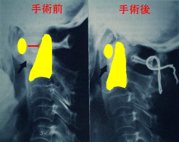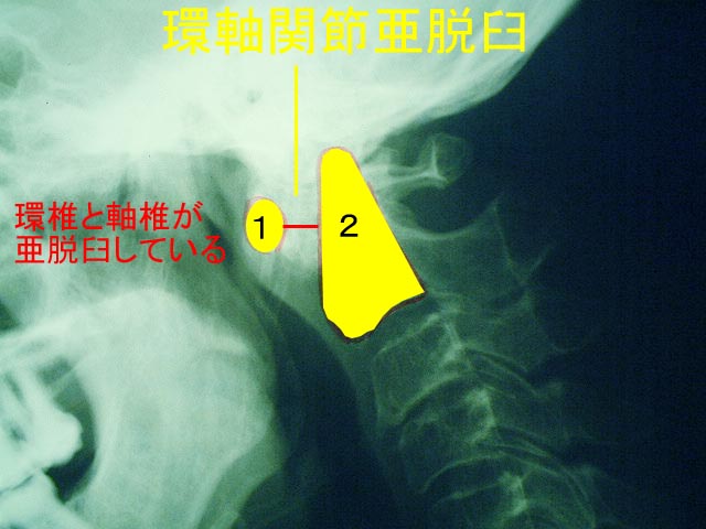 | 関節リウマチは四肢の関節(手足の関節)を破壊するばかりでなく、脊椎にもリウマチ病変を発生させます。特に環軸関節(首の1番目と2番目の関節)には多数の滑膜が存在するためリウマチ病変の好発部位となります。 病変が進行しますと、環軸関節が破壊され環軸関節亜脱臼(首を前に倒すと頚椎の1番目と2番目がずれる状態)を生じ、頚部痛や後頭部痛や頚部運動時の雑音(首の動きによって「コツコツ」と音がする)、頚部運動障害(首の動きが悪い)などの局所症状を訴えます。 中には脊髄が圧迫されて四肢麻痺(手足の麻痺)を来たすこともあります。時に軽微な外傷で脊髄損傷を生じ「突然死」に至ると言う報告もありますので要注意です。手術的治療は長期に渡り局所症状を認める症例や亜脱臼の程度が強く、将来、麻痺が予測される症例に対して検討されます。