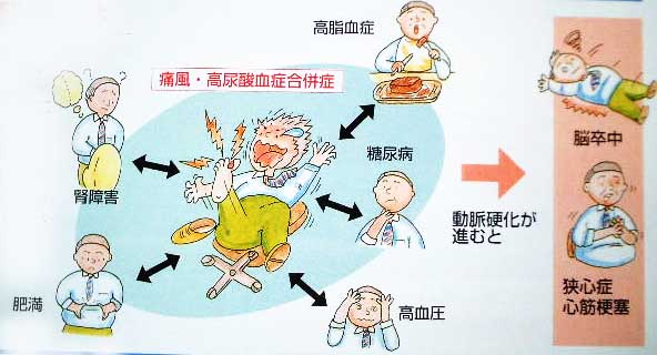 | 症状は数年間の無症候性高尿酸血症(尿酸値は高いが症状を認めない状態)を経て、ある日、突然に痛風発作 を発生します。ただし、発作時に必ずしも尿酸値が高いわけでもありませんので診断の際は注意して下さい。 典型的な発作は足の親指に好発します。しかし最近では、色々な部位の関節(足、足趾、膝、手、指)に痛風発作(尿酸結晶沈着性関節炎)を認めます。痛みは運動時のみならず安静時や夜間に耐え難い激痛として認められます。また、関節以外の軟部組織(軟骨やアキレス腱、皮下など)に沈着します。レントゲン検査では関節の軟骨下骨が破壊され、骨の穴状の病変を認め、やがて骨変形を来します。 昔は裕福な貴族で飽食を好む中年に好発したため「ぜいたく病」とか「帝王病」と呼ばれていました。最近では食生活の欧米化に伴い若者に多発する傾向にあります。大半が男性で、30歳〜50歳代に多く、女性は高齢者に認められる傾向にあります。診断は偏光顕微鏡検査で尿酸結晶を認めれば確定されます。 なお、鑑別疾患に偽痛風があります。偽痛風は高齢者の女性に比較的多く、レントゲンでは線状の石灰化像を認めます。特に膝関節や肘関節、手関節、足関節などの大きな関節に発症します。疼痛などの症状は痛風発作と同様に関節穿刺で黄色の混濁液(ピロリン酸カルシウム結晶沈着性関節炎)を認めます。炎症反応(CRP、白血球、赤沈)が異常高値になります。しかし尿酸値は正常です。診断は偏光顕微鏡検査でピロリン酸カルシウム結晶を認めれば確定されます。 高尿酸血症を治療せずに放置すると余剰な尿酸は組織に沈着し尿路結石や慢性腎臓病(昔は尿毒症で死亡しておりました)、動脈硬化、脳血管障害、狭心症、心筋梗塞などの合併症を併発させます。高尿酸血症はメタボリックシンドロームの誘因の一つです。したがって痛風や高尿酸血症と診断されますと、生涯にわたり尿酸値のコントロールが必要になります。 |