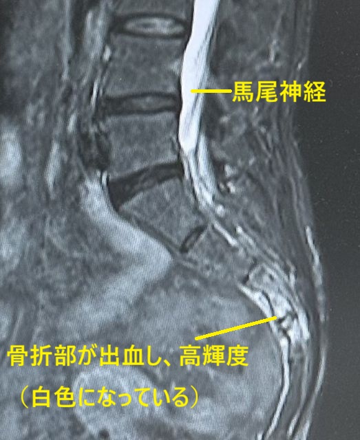 | 仙骨や尾骨は骨盤の一部を構成しています。尻もちをついたり、臀部を蹴られたり、交通事故やスポーツ外傷などの転倒や転落などでよく起こります。これらの骨折は年齢を問わず発生します。特に骨粗鬆症を有する高齢者は高頻度に発生します。いわゆる脆弱性仙骨骨折(骨が脆いので、ちょっとしたことですぐ折れる)として発生します。 症状 症状は椅子などに座った際に仙骨部や尾骨部の痛みを訴えます。ただし尾骨骨折は立位や歩行時にあまり痛みを訴えません(歩行時は尾骨に体重が乗らないので)。仙骨骨折は仙骨が骨盤と連動しているので歩行時痛や体動時痛を訴えます。 診断 うつ伏せにして、仙骨部や尾骨部を圧迫すると飛び上がるような痛みを訴えます。時に仙骨骨折は神経損傷(足の感覚障害や筋力低下)や尿路障害などの合併症を訴えることもありますので要注意です。診断はレントゲン検査(仙骨骨折、尾骨骨折、尾骨亜脱臼)で容易に判断できます。骨折が疑われる場合はMRI検査で確定診断します。時に経過中に転位されて(ずれて)症状が長引く症例を経験します。 治療 保存的治療が原則です。日常生活動作の指導を行います。椅子などに座る際に仙骨部や尾骨部に直接体重がかからないような姿勢を取っていただきます(上体を前に倒す姿勢など)。また臀部に円座やクッション性のあるものを置き、疼痛緩和に努めます。なお骨癒合(骨がつく)には2〜3ヶ月間を要します。手術的治療は、長期間にわたり疼痛が改善されない症例や神経損傷を認める症例で検討されます。